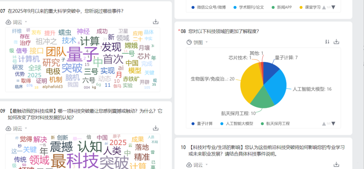 活动以2025年9月以来以来任一科学界重大事件或研究成果为内容,引导同学们主动深入科学前沿。参与者们通过查阅文献、深入学习,围绕各自感兴趣的科学事件,撰写了内容丰富、思考深入的文章。调查显示,学生在获取科技资讯方面呈现出“主流引领、多元补充”的特征。绝大多数同学通过“微信公众号/微博”等新媒体平台及“学术期刊/论文”专业渠道关注科技动态,同时辅以“新闻APP”“课堂学习”与“同学/老师交流”等方式,反映出信息获取路径的多样性与互补性。在科技突破内容方面,同学们的关注点高度集中于2025年9月以来量子计算、生物医学、人工智能与航天工程等前沿领域。展现出同学们对国家重大科技项目与颠覆性技术的高度敏感。“生物医学/免疫治疗”“量子计算”“人工智能大模型”及“航天探月工程”是大家普遍关注的方向。这些方向不仅与全球科研热点高度吻合,也体现出同学们在认知前沿的同时,能够结合自身专业背景进行跨领域思考与创意延伸。