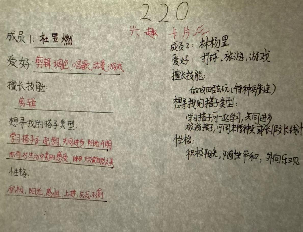 本次活动旨在充分展现学生个性与团队协作精神。活动中,各宿舍共同设计特色兴趣卡片,填写“我们热爱”与“我想寻找”等内容。涵盖乐器、绘画、编程、摄影等多个领域。卡片形式多样,既有手绘插画,也有电子设计,创意纷呈。