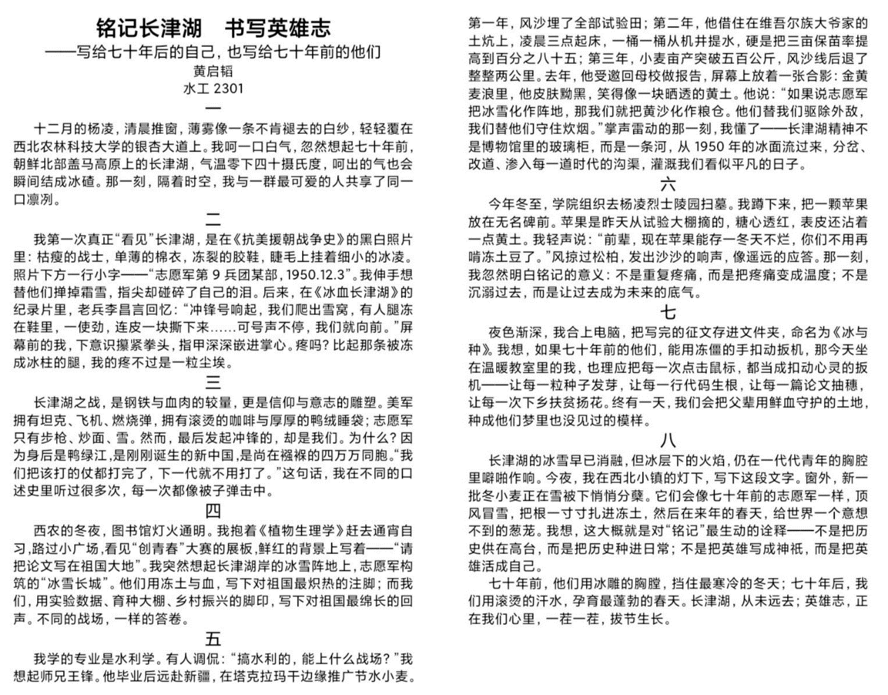 鸭绿江上的波涛,曾见证了志愿军将士的铁血丹心;上甘岭上的硝烟,永远铭刻着英雄儿女的不朽功勋。为深切缅怀抗美援朝战争中的革命先烈,弘扬伟大的抗美援朝精神,引导广大青年学子铭记历史、砥砺奋进,由西农创新者联盟举办的“铭记长津湖战役,传承英雄爱国魂”——纪念抗美援朝主题征文活动于2025年12月25日至10月27日顺利开展并圆满落幕。本次活动以线上形式进行,面向全校本科生征集文稿,得到了同学们的热烈响应。